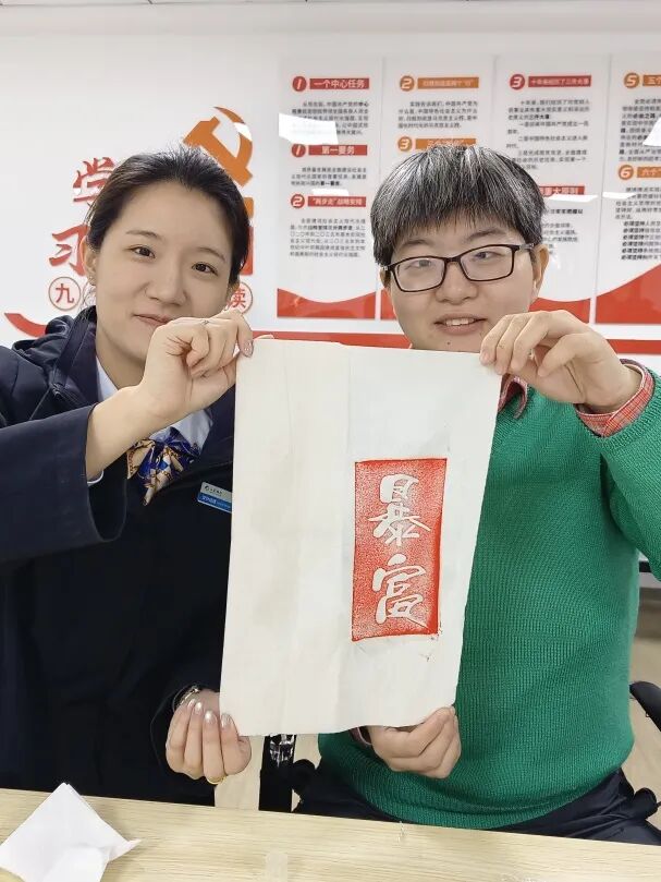 每一处按压、每一次上墨,都是与古老智慧的直接对话。残友们展示着自己拓印的“新春”图案,笑容灿烂:“当新年的台历跃然于手掌,新年便不再遥远了。”