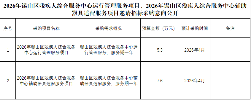 备注:1.我单位上述2个项目进行采购意向公开及采购需求(附件1、附件2)意见公示(公示期为五个工作日)。2.如有意向参与上述项目投标的供应商,在2026年4月7日17:00前,递交如下资料至无锡市锡山区残疾人联合会(锡山区锡沪东路东亭中段81号)5楼(511)办公室:①法定代表人授权委托书(附件3);②申请表(附件4);③营业执照复印件。
