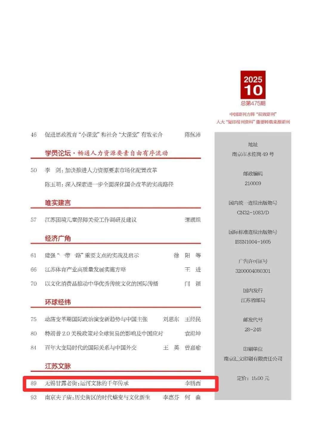 近日,我校咨政调研科李鹏西老师的论文《无锡甘露老街:运河文脉的千年传承》在中共江苏省委党校(江苏行政学院)《唯实》发表。