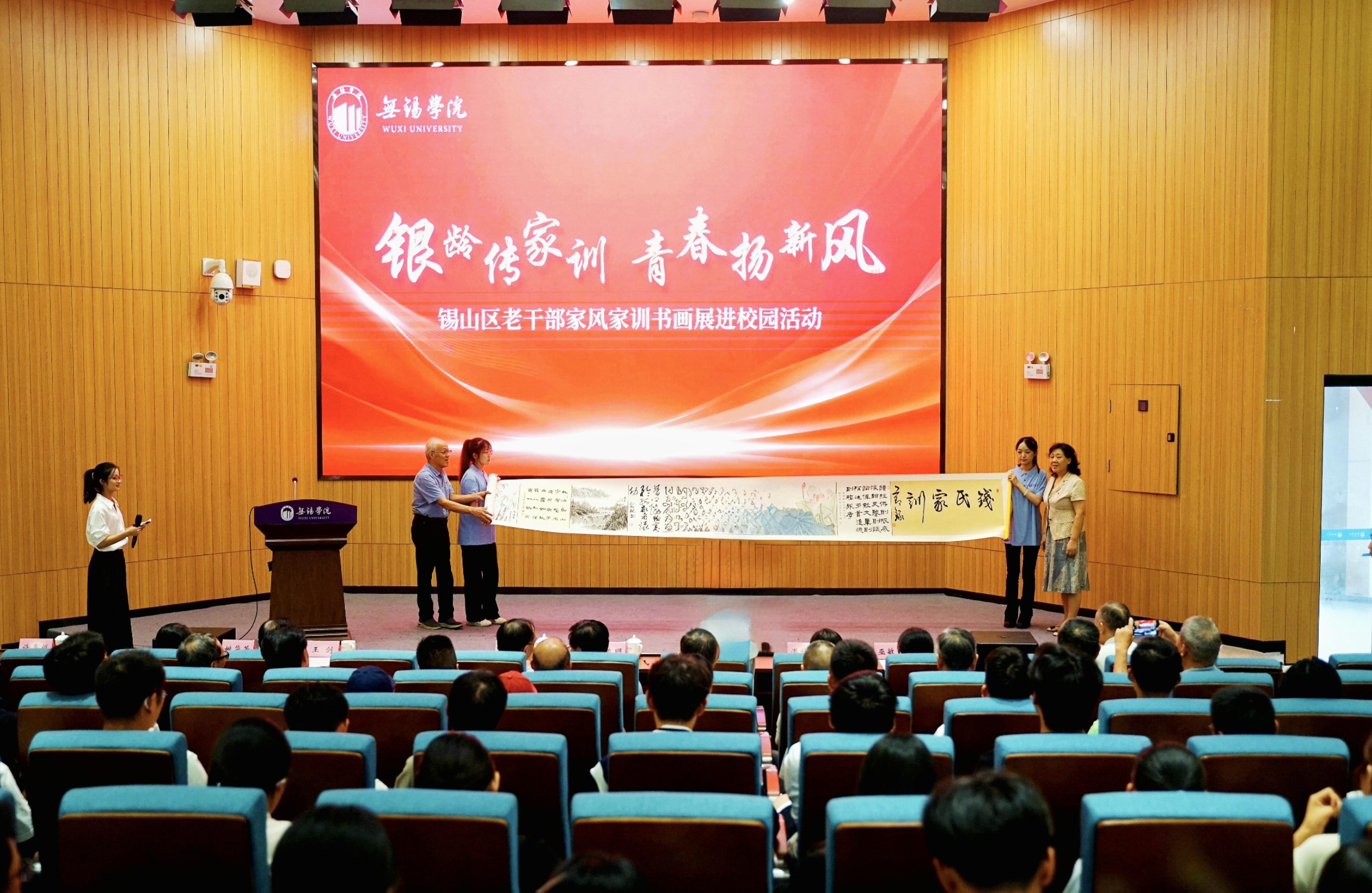 活动在学生深情朗诵《钱氏家训》的朗朗声中拉开帷幕。无锡学院纪委书记王友明在致辞中强调,家风建设是落实立德树人根本任务的重要支撑,学校将持续推动家风文化融入教育教学全过程,以优良家风滋养青年成长、筑牢廉洁防线。随后进行的“银青对话”环节温情而庄重,老干部代表向学校赠送书法作品,并向学生代表赠予凝聚家风智慧的长卷,体现了老一辈对青年一代的殷切期望与文化托付。