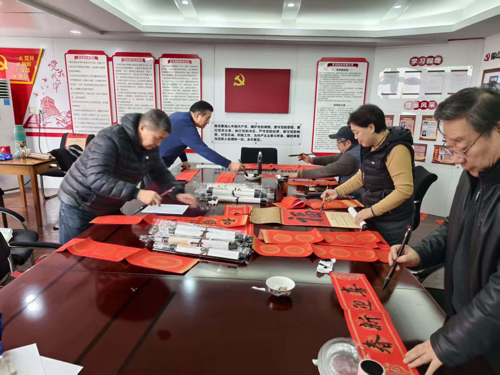 活动现场墨香四溢,气氛热烈。老同志们精神矍铄,挥毫泼墨,饱含深情地在挂轴上书写一个个苍劲有力、风格各异的“福”字。这些“福”字,有的圆润饱满,寓意团圆美满;有的遒劲洒脱,彰显壮志豪情。一笔一划间,不仅展现了老同志们深厚的书法功底和艺术修养,更凝聚着他们对家乡的深厚情感以及对在外拼搏的锡山乡贤们的诚挚牵挂与美好祝愿。