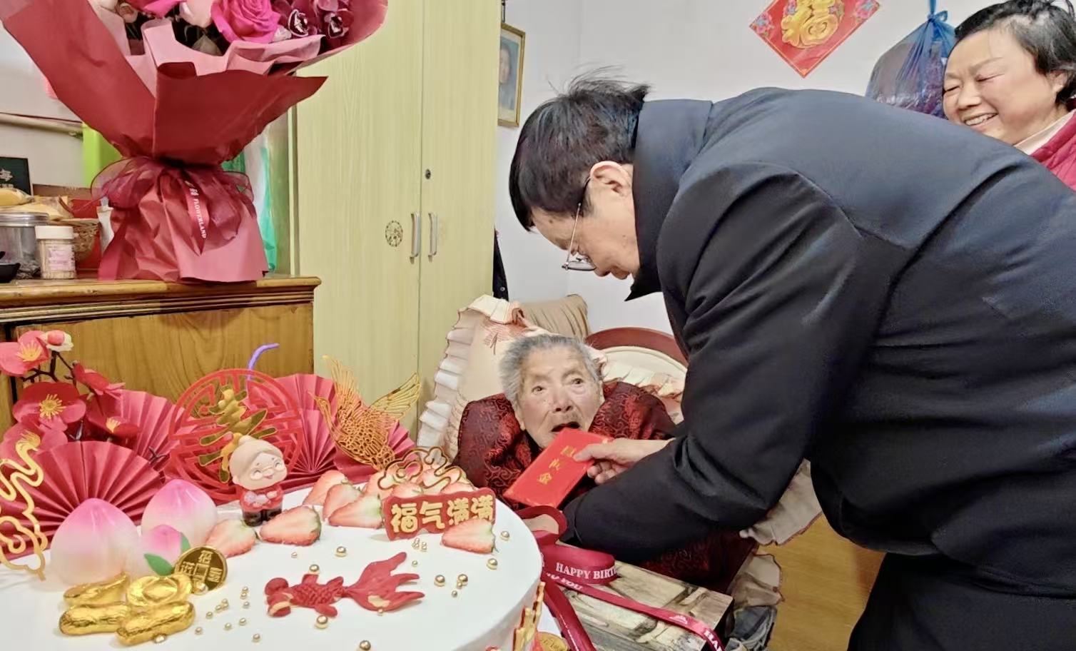 最动人的一幕,发生在一户百岁老人家中。老人的儿子常年在海外工作,春节无法返乡。得知这一情况后,工作室带着蛋糕和鲜花上门,为老人提前过了一个热闹的生日。事后,远在海外的儿子发来微信:“你们替我尽了一份至真至孝的心意。”寥寥数语,道出的是一位游子的愧疚,也是一群老兵老党员替他兑现的团圆。