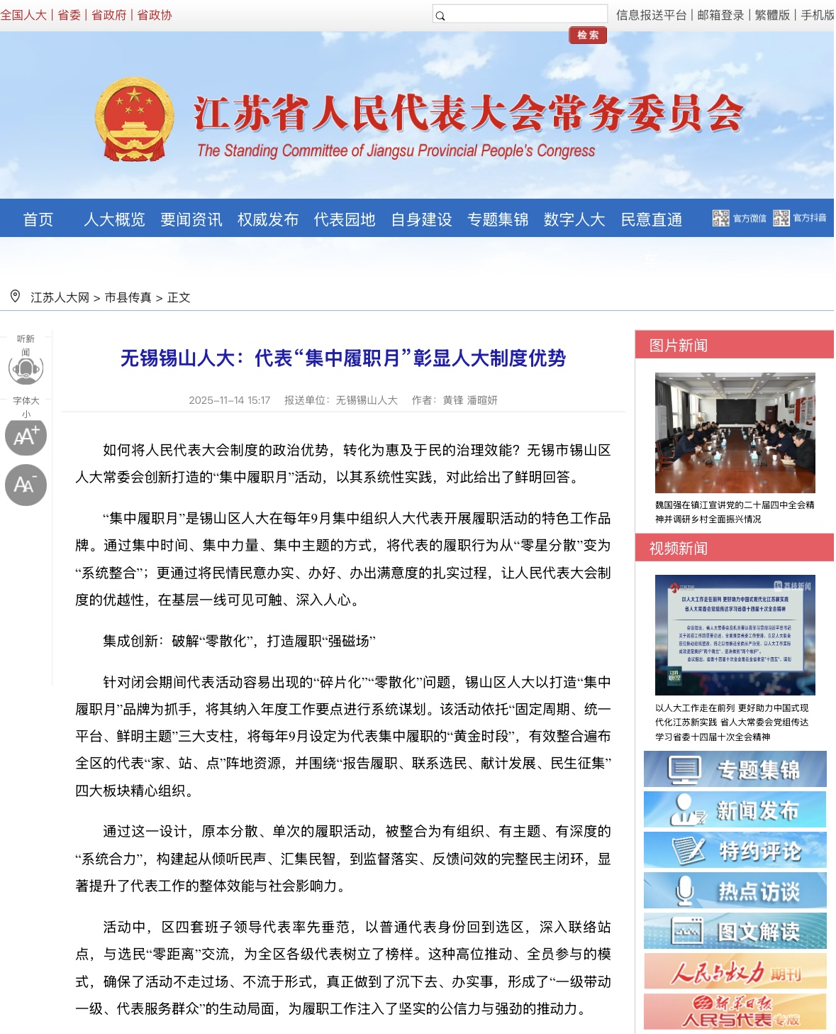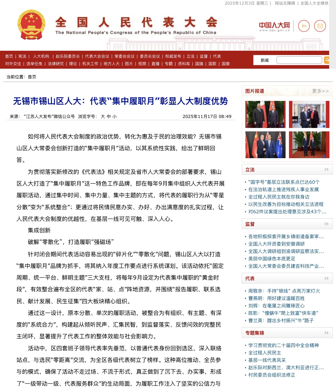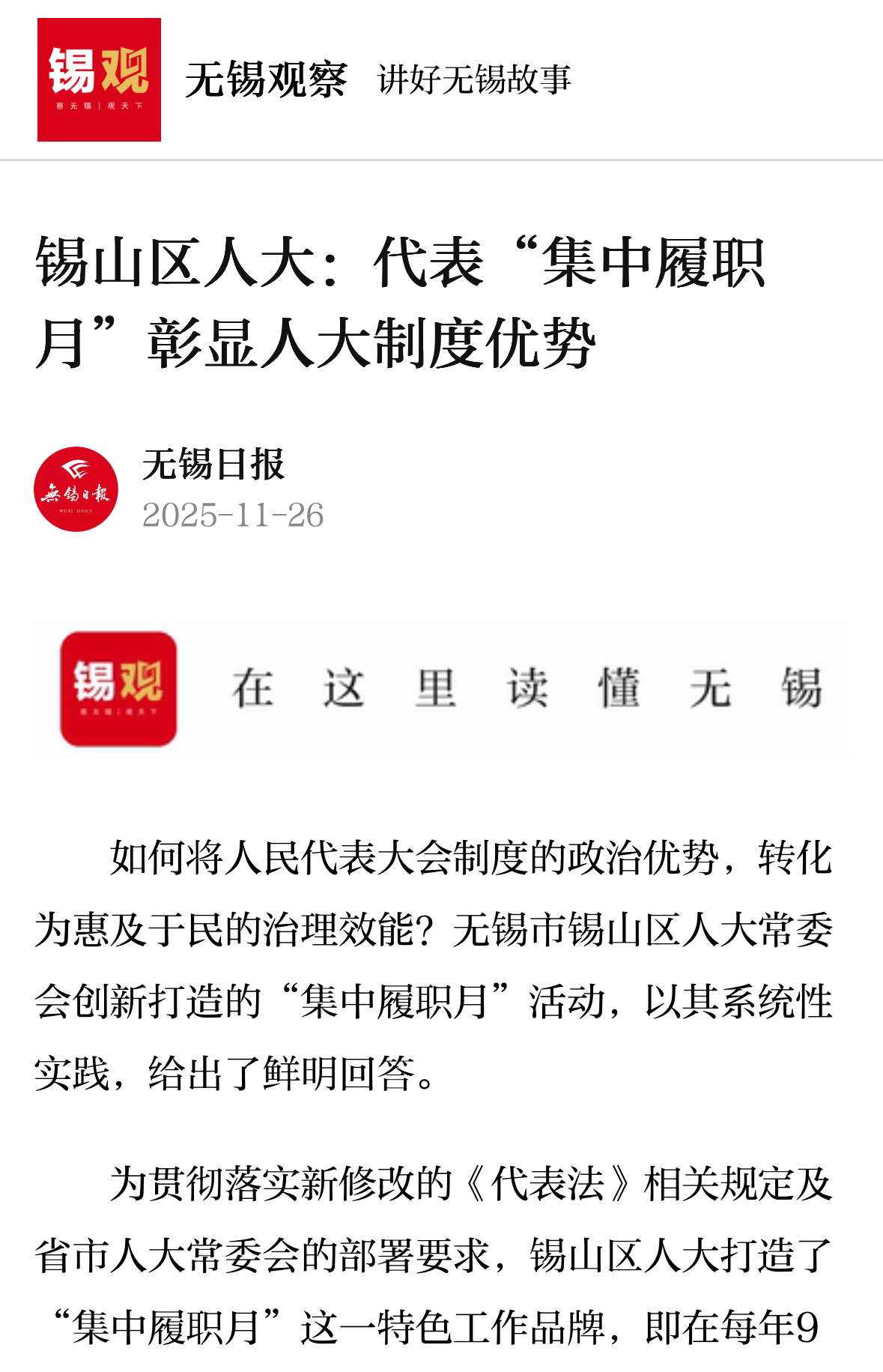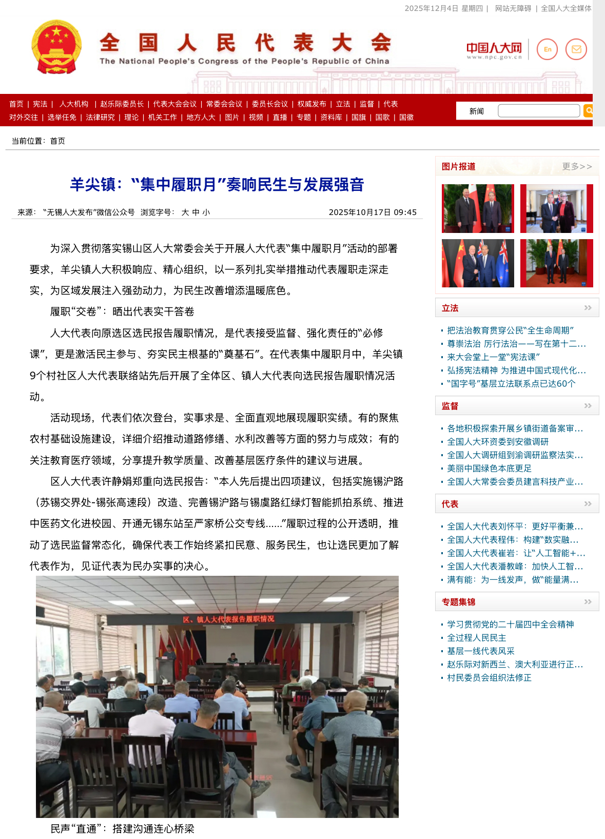 全国人大网站推出《无锡市锡山区人大:代表“集中履职月”彰显人大制度优势》专题报道,并发布《面对面交“答卷” 实打实受监督——锡山区扎实推进人大代表报告履职工作》《羊尖镇:“集中履职月”奏响民生与发展强音》等多篇文章,系统展示了从区级统筹到乡镇落实、从机制构建到代表履职的全流程实践。