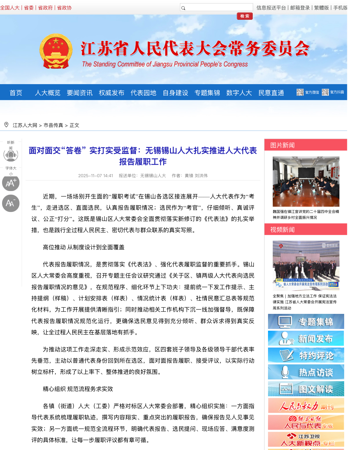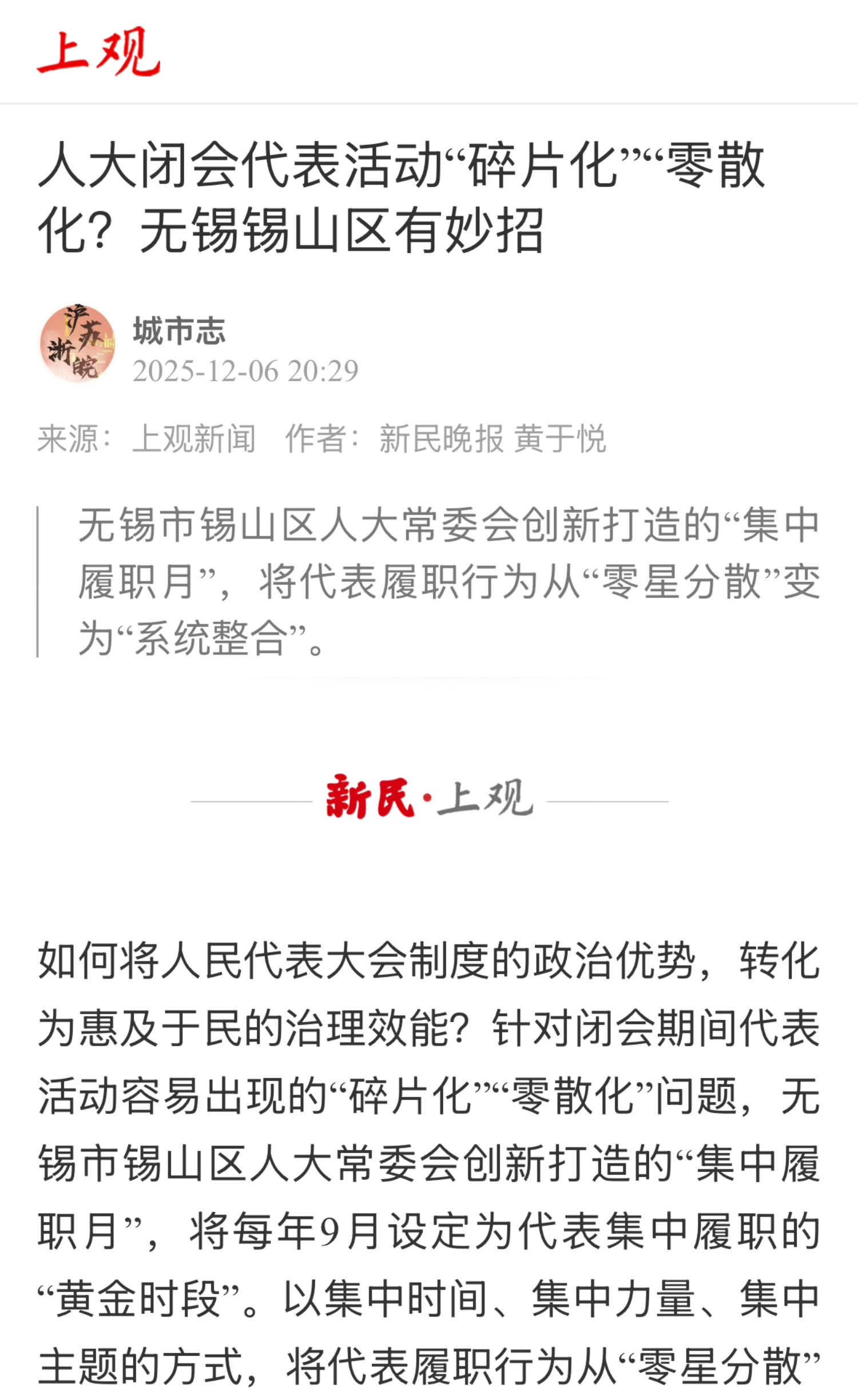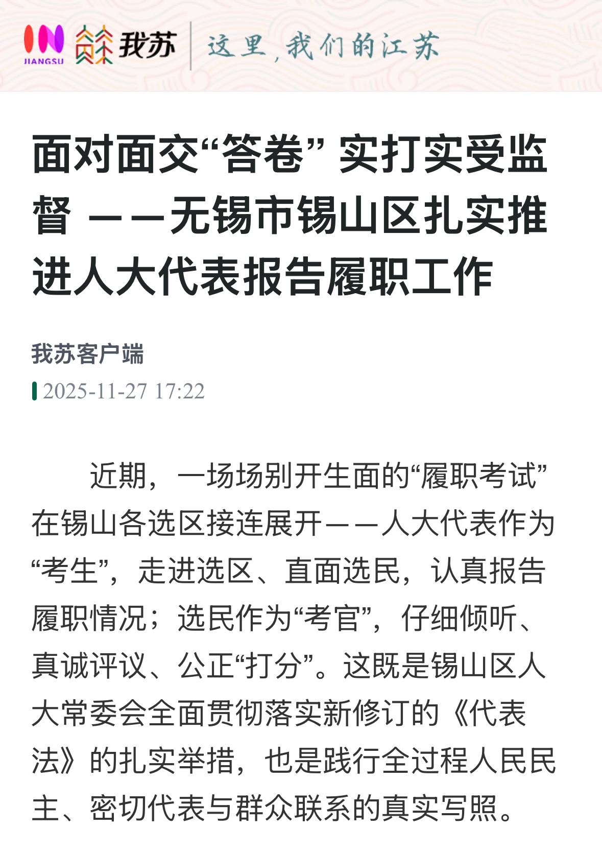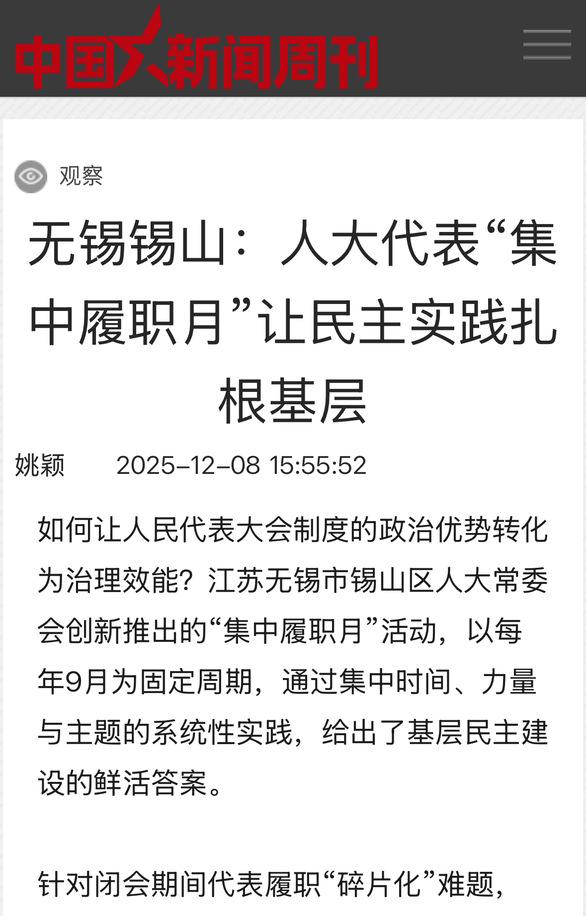 全国人大网站推出《无锡市锡山区人大:代表“集中履职月”彰显人大制度优势》专题报道,并发布《面对面交“答卷” 实打实受监督——锡山区扎实推进人大代表报告履职工作》《羊尖镇:“集中履职月”奏响民生与发展强音》等多篇文章,系统展示了从区级统筹到乡镇落实、从机制构建到代表履职的全流程实践。