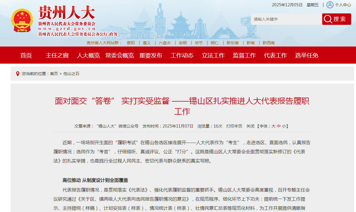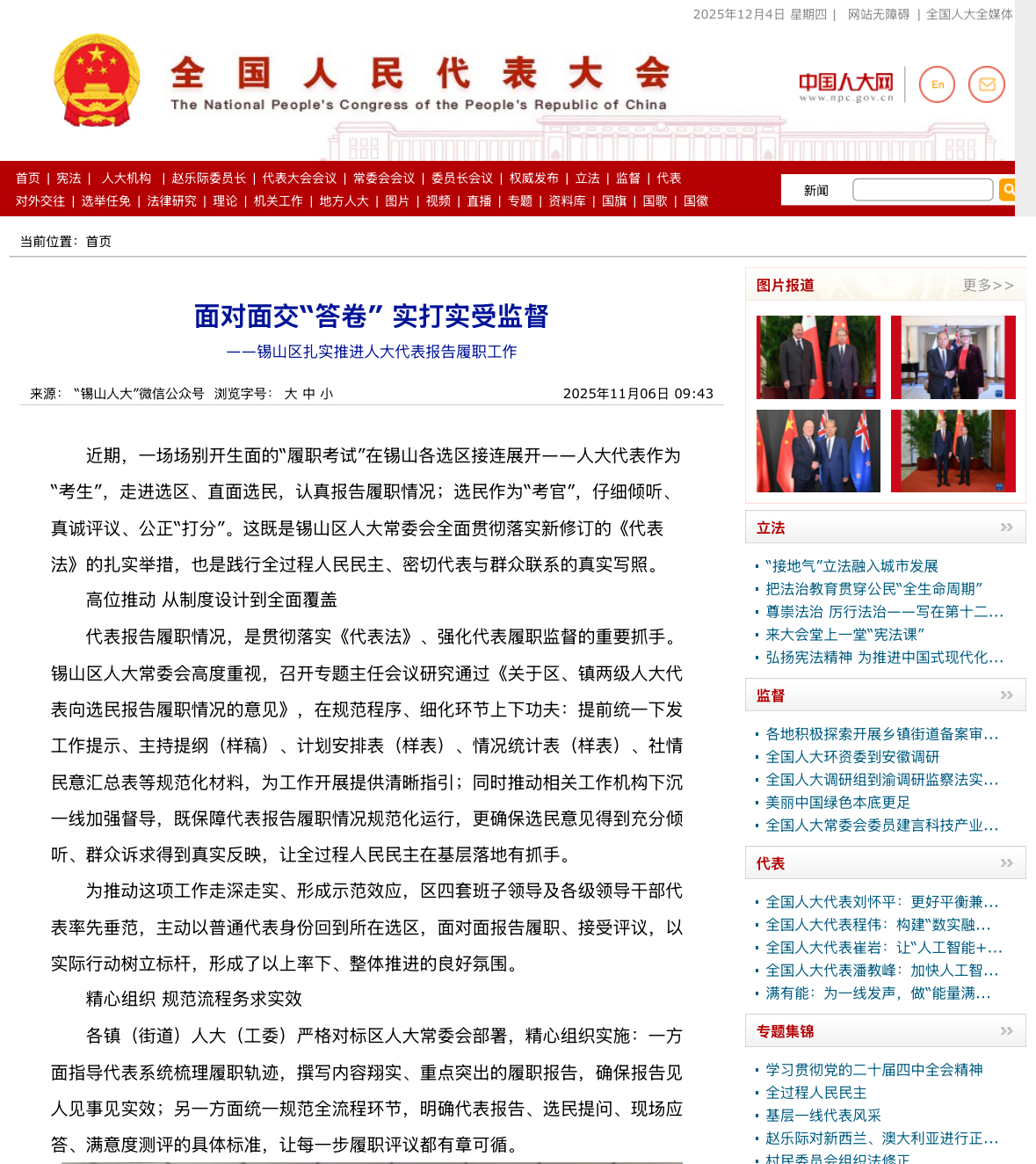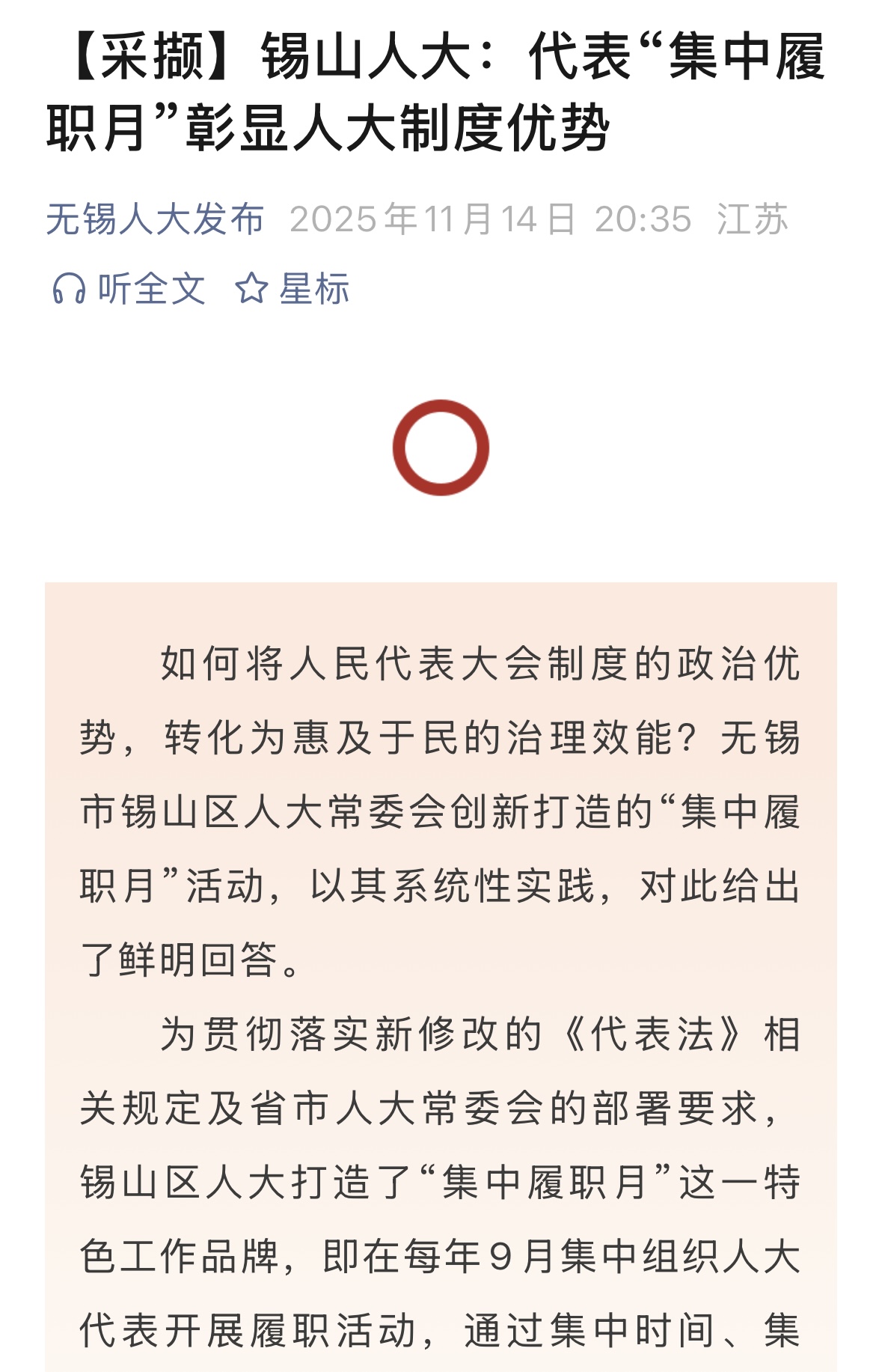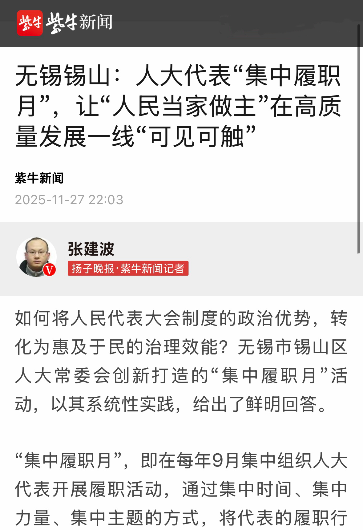 全国人大网站推出《无锡市锡山区人大:代表“集中履职月”彰显人大制度优势》专题报道,并发布《面对面交“答卷” 实打实受监督——锡山区扎实推进人大代表报告履职工作》《羊尖镇:“集中履职月”奏响民生与发展强音》等多篇文章,系统展示了从区级统筹到乡镇落实、从机制构建到代表履职的全流程实践。