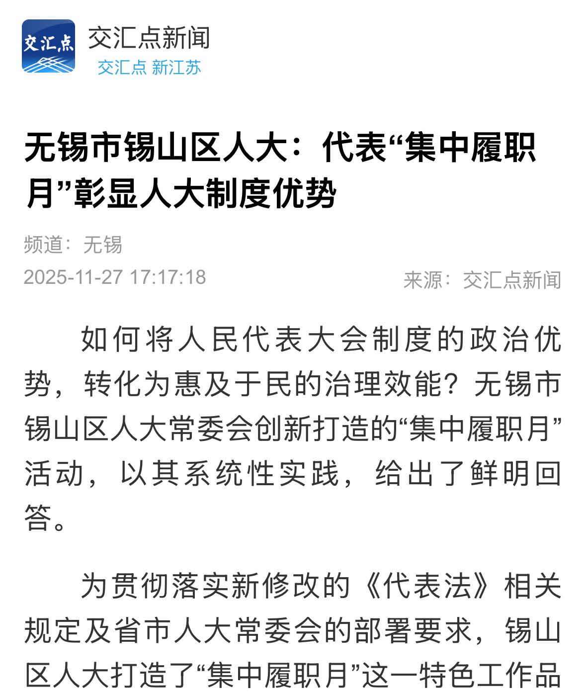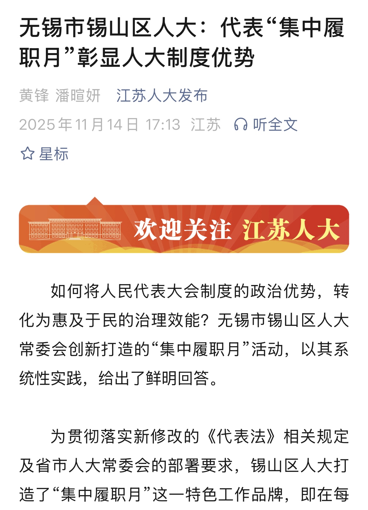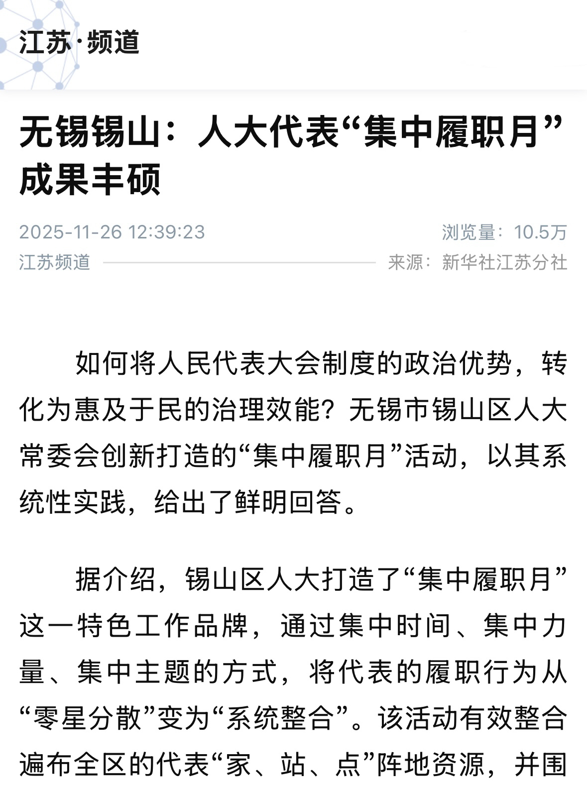 近期,锡山区人大常委会开展的人大代表“集中履职月”活动先后在全国人大网站、江苏人大发布、江苏省人大网站、无锡人大发布、新华社客户端、中国新闻网、交汇点新闻、我苏网、扬子晚报(紫牛新闻客户端)、无锡日报(无锡观察客户端)、新民晚报(上观新闻客户端)等多家中央省市级人大媒体和主流新闻平台报道,并被其他省市人大网站转载,形成了多层次、广覆盖的宣传声势,生动展现了基层人大工作的活力与制度效能。