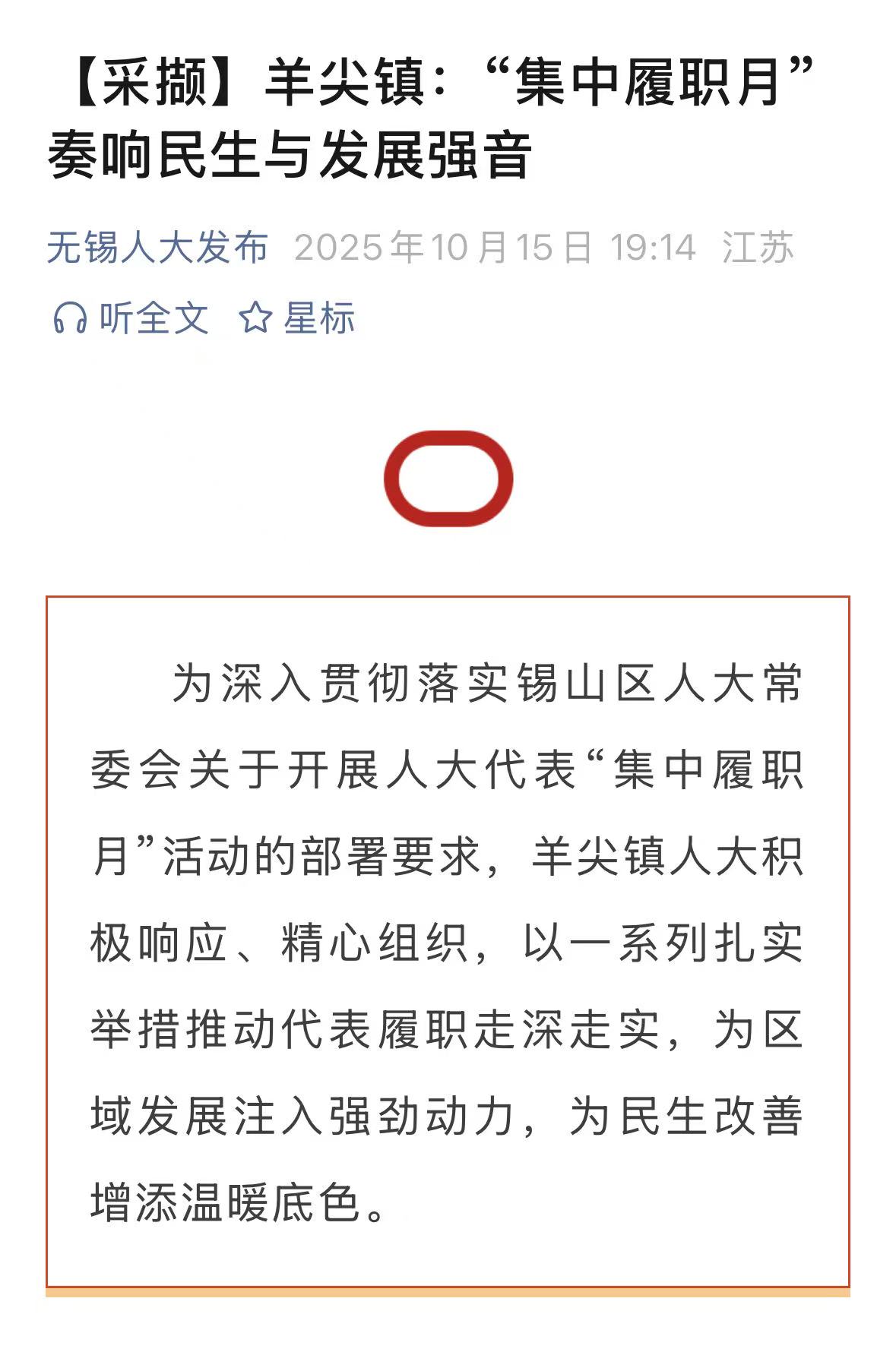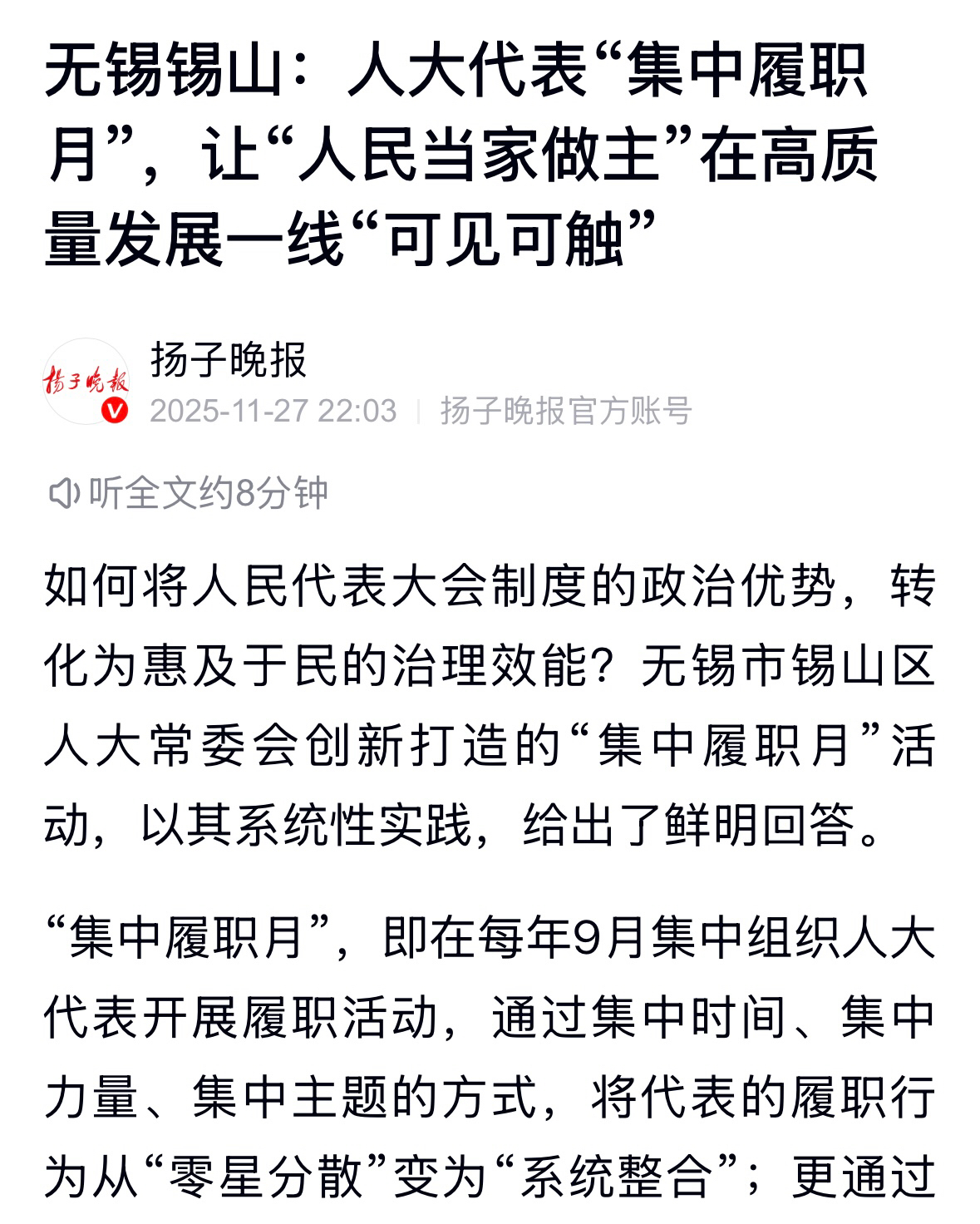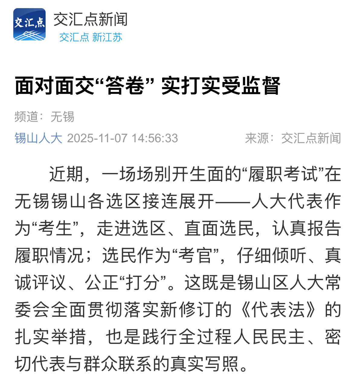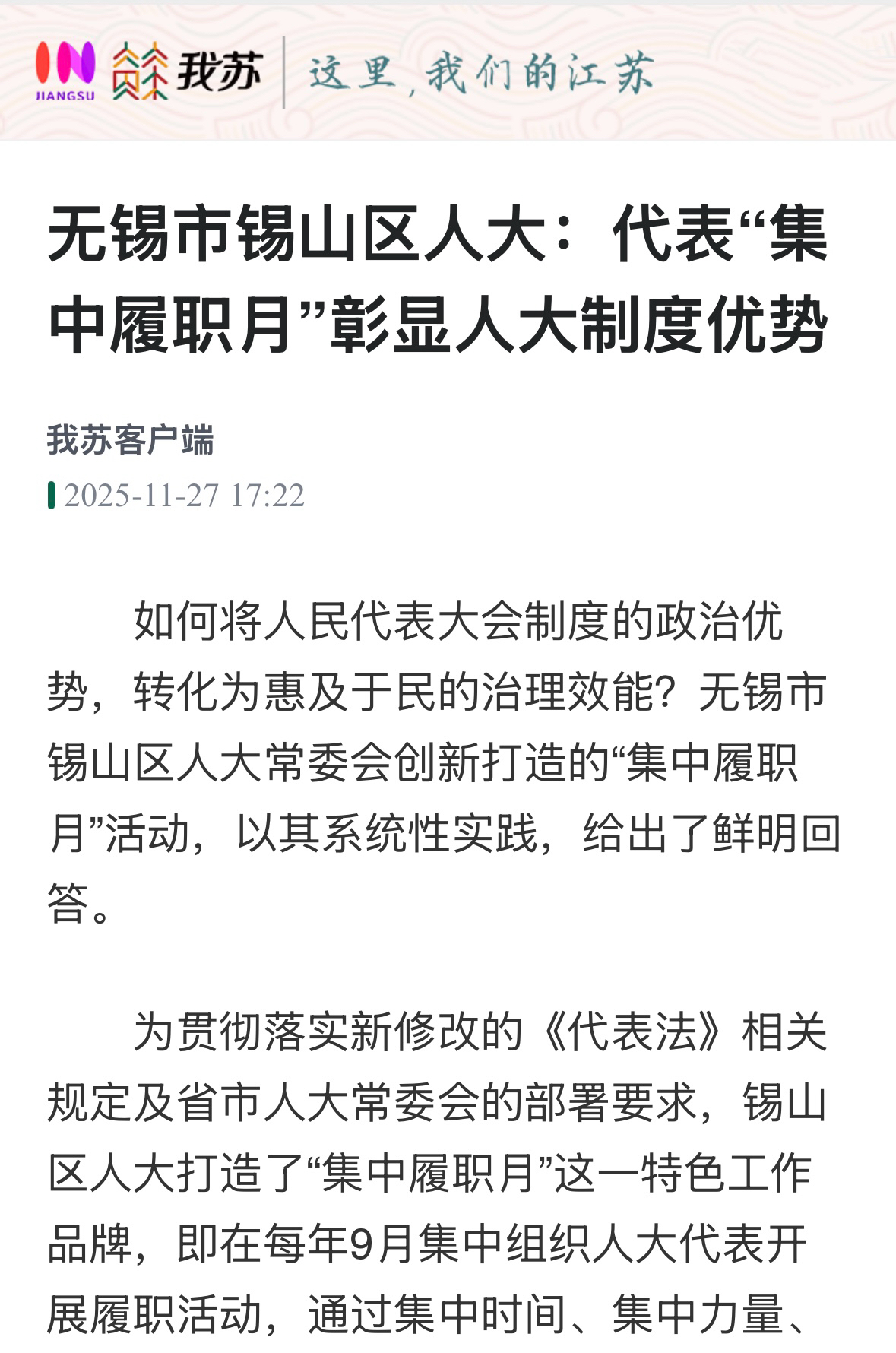 近期,锡山区人大常委会开展的人大代表“集中履职月”活动先后在全国人大网站、江苏人大发布、江苏省人大网站、无锡人大发布、新华社客户端、中国新闻网、交汇点新闻、我苏网、扬子晚报(紫牛新闻客户端)、无锡日报(无锡观察客户端)、新民晚报(上观新闻客户端)等多家中央省市级人大媒体和主流新闻平台报道,并被其他省市人大网站转载,形成了多层次、广覆盖的宣传声势,生动展现了基层人大工作的活力与制度效能。