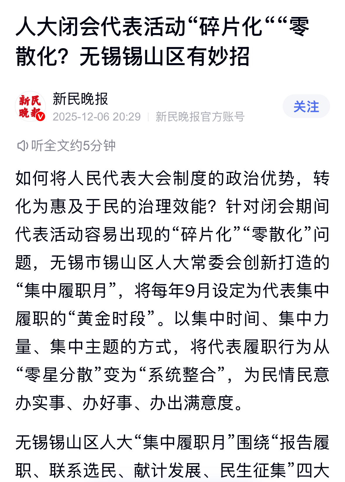 “集中履职月”不仅是锡山人大打造的工作品牌,更逐步成长为集代表履职、人民监督、推动发展、服务民生于一体的系统性民主实践平台。活动通过组织代表集中走访、专题调研、履职报告、民意征集等形式,进一步畅通了代表与群众之间的联系渠道,推动了一批民生实事的落地解决,在发挥代表作用、增强监督实效、凝聚发展共识等方面取得了扎实成效。