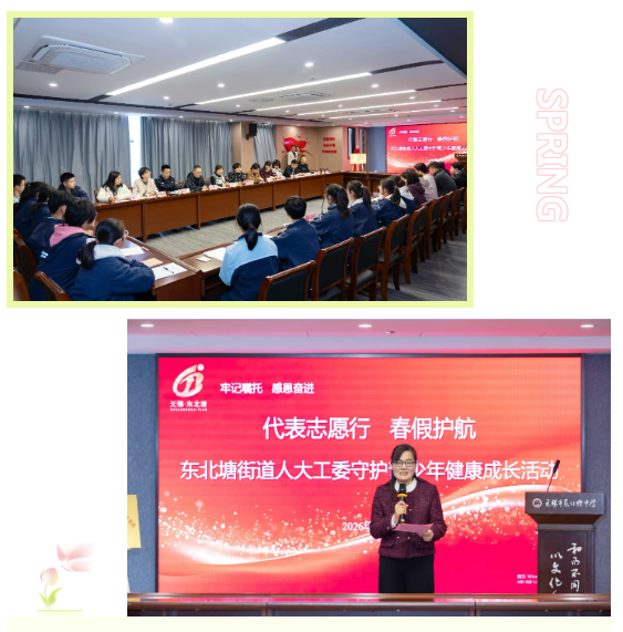 春风有信,花开有期。随着2026年江苏省中小学春假全面推行,为保障青少年度过安全、健康、有意义的假期,3月26日下午,东北塘街道人大工委在东北塘中学北校区开展“代表志愿行 春假护航”活动。此次活动将“牢记嘱托,感恩奋进”学习实践活动与青少年权益保护深度结合,搭建起“人大引领、代表带头、多方联动、家校协同”的春假护航框架,让人大代表的责任与担当延伸至青少年成长关键阶段。
