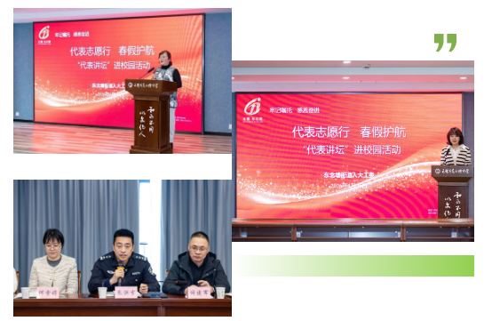 护航有温度,更有知识厚度。区人大代表、“康乃馨”爱心基金代表胡永雅围绕青少年心理健康成长,分享暖心故事,引导孩子们正确面对成长烦恼,保持阳光向上的心态。东北塘街道议政代表、“老船长爱心公益社”秘书长王晓红以“乘风破浪的假期——安全自护与探索精神”为题,用生动的案例讲解春假出行、户外活动等内容。派出所所长朱洪吉说“你们放春假,骗子可不放春假。”他用风趣幽默的语言,为学生们敲响防拐防骗、网络安全、身体边界守护及预防性侵的警钟,切实筑牢青少年假期安全防护网。