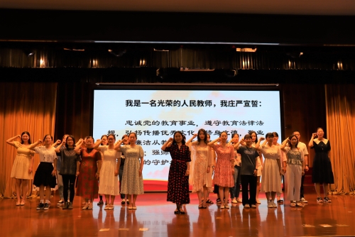 东港镇纪委在教师节来临前夕,督促教育部门采取多项防范措施,向全镇教师敲响廉洁从教警钟,将师德师风教育作为教师“开学第一课”。督促学校通过在微信公众号发送廉洁过节倡议书、签订《师德师风责任状》、教师宣誓等方式,营造廉洁校园文化氛围。图为教师宣誓现场。(陆润)